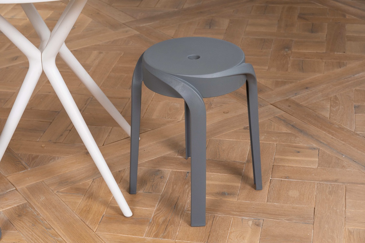 Un altro vantaggio è che il buco evita la formazione di vuoto o “effetto ventosa” quando gli sgabelli vengono impilati. Così è più semplice separarli senza sforzo e senza rischiare di romperli, cosa che chiunque abbia provato a staccare una pila di sedie molto incastrate conosce bene.
