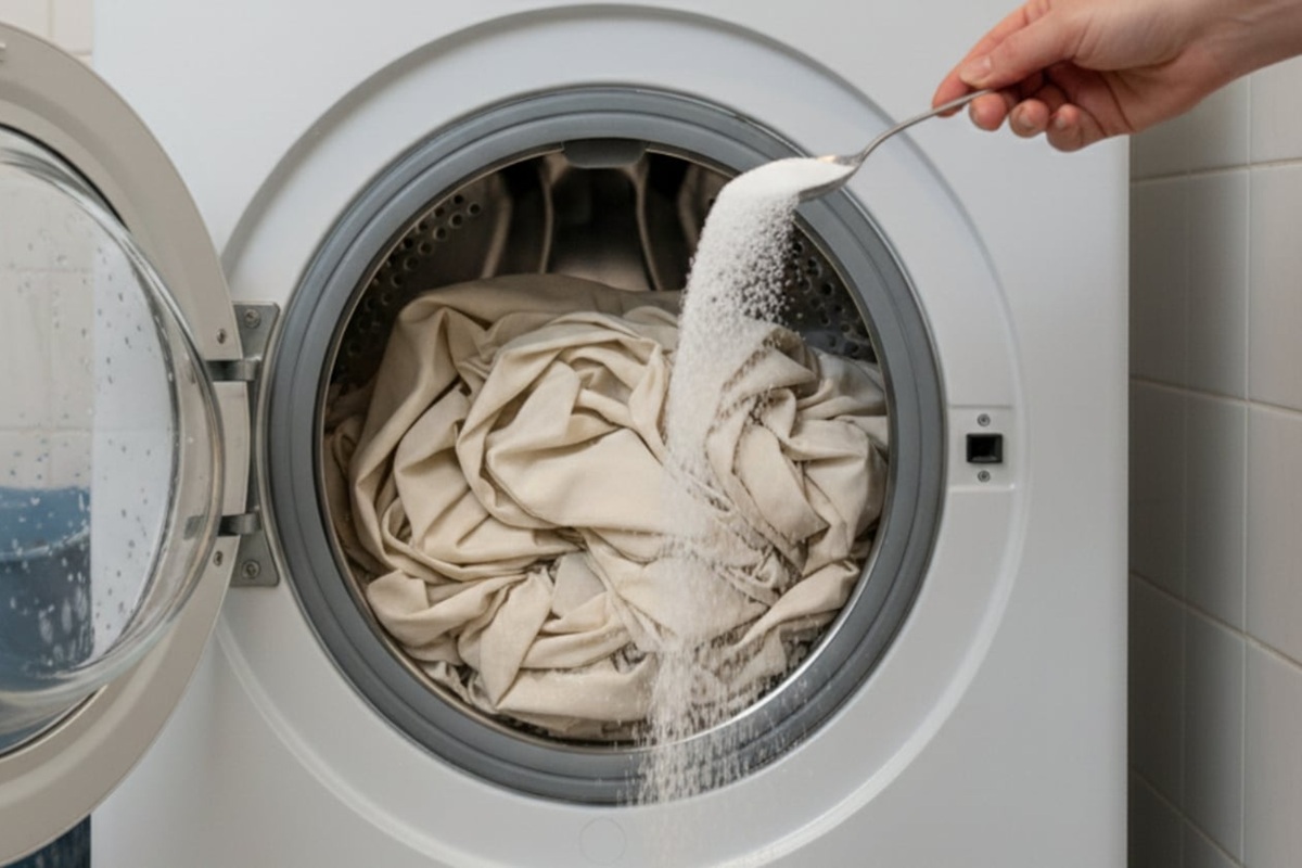 A questo punto arriva il momento chiave del trucco per evitare di stirare: invece di aggiungere l’ammorbidente, è necessario aggiungere un cucchiaio di zucchero. Questo ingrediente non danneggia la lavatrice e conferisce alle tende un aspetto più ordinato e una migliore caduta.
